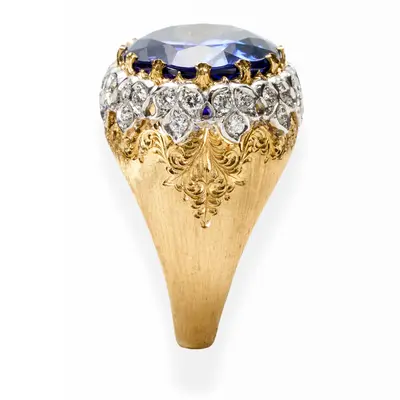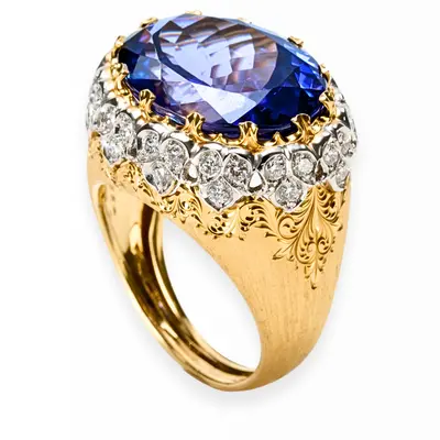 18k yellow and white gold ring. Central oval-cut tanzanite weighing 15.24 ct set in sculpted claws, framed by 0.59 ct of brilliant-cut diamonds set in a pierced three-leaf motif in white gold. The ring’s band is engraved with millefili and decorated with graffito patterns.