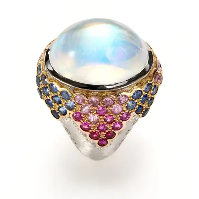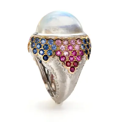 Anello in oro bianco e giallo 18 carati. Labradorite centrale taglio cabochon 21,74 carati. Corpo dell'anello inciso a millefili e graffito decorato da un pavé di corindoni multicolore per 2,34 carati e zaffiri per 2,45 carati su oro giallo.