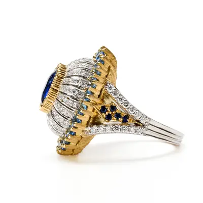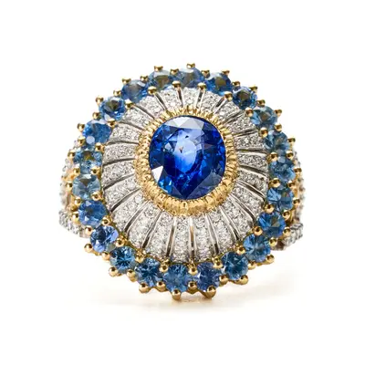 Anello in oro bianco e giallo 18 carati. Zaffiro centrale 3,04 carati in castone modellato, cupola cesellata impreziosita da file di pavé di diamanti taglio brillante. Base della cupola a griffe in oro giallo decorata con incisione a millefili e 2,61 carati di zaffiri. Corpo dell'anello in oro bianco con incisione a mano, pavé di brillanti e inserti a forma di lancia in oro giallo con zaffiri. Brillanti per un totale di 0,74 carati.