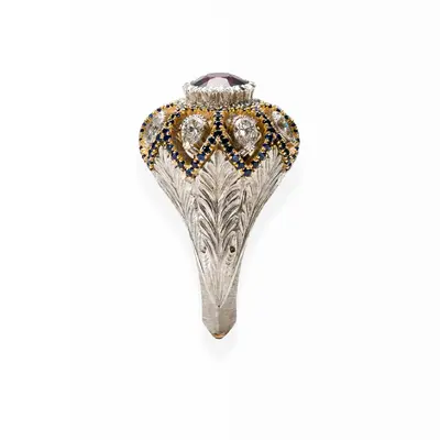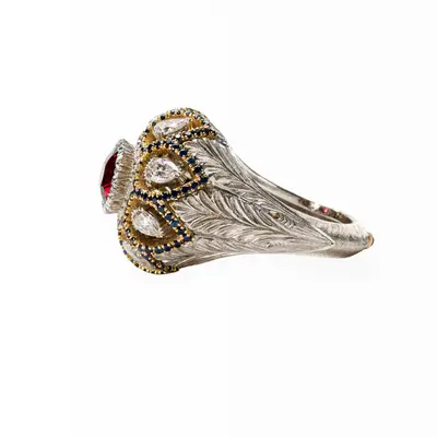 Anello in oro bianco e giallo 18 carati. Spinello rosso centrale taglio ovale 2,21 carati in castone modellato in oro bianco. Cupola traforata a goccia con griffe in oro giallo con 1,20 carati di zaffiri incastonati e diamanti taglio goccia per 1,09 carati in ponticelli sospesi. Corpo inciso a mano con motivo a tre foglie.