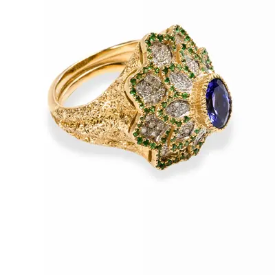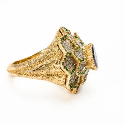Anello in oro bianco e giallo 18 carati. Zaffiro centrale Royal Blu non trattato, taglio ovale 2,3 carati in castone modellato. Parte superiore cesellata e traforata con contorni in oro giallo incisi a rigato e pavé di tsavoriti verdi, motivo geometrico romboidale in oro bianco con pavé di diamanti taglio brillante da 0,18 carati e 0,39 carati. Corpo dell'anello cesellato e inciso a graffito e millefili.