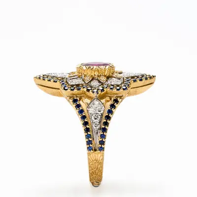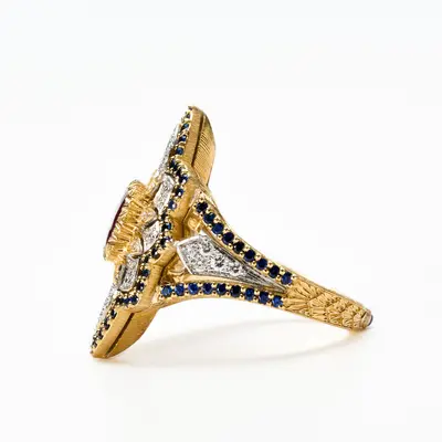 Anello in oro giallo e bianco 18 carati. Rubino Sangue di Piccione non trattato, taglio ovale 1,5 ct in castone modellato in oro giallo circondato da petali in oro giallo con brillanti. Motivo geometrico romboidale in oro bianco traforato e cesellato a mano con pavé di diamanti taglio brillante da 0,42 carati. Fascia esterna di zaffiri incastonati in griffe di oro giallo e fondello inciso a millefili. Corpo dell'anello traforato con 0,86 carati di zaffiri in griffe di oro giallo e palmetta in oro bianco con pavè di brillanti. Fascia inferiore dell'anello incisa a millefili.