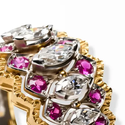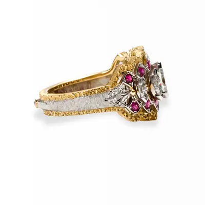 Anello in oro giallo e bianco 18 carati. Fascia centrale traforata con diamanti taglio navette 0,94 carati incastonati in oro bianco e contornati da rubini 0,43 carati incastonati in motivo a fiocco. Corpo dell'anello in oro bianco inciso , contorno dell'anello in oro giallo inciso lateralmente a millefili e pallettato nella parte superiore.
