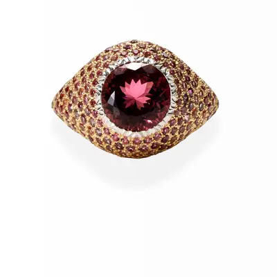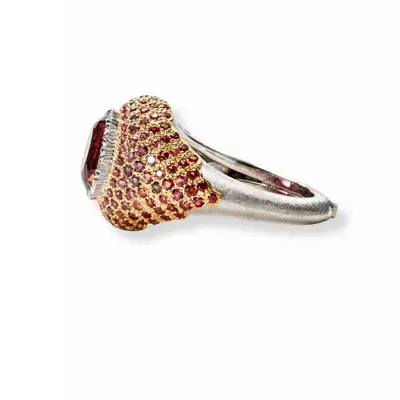 Anello in oro bianco e giallo 18 carati. Tormalina rosa centrale taglio ovale 3,63 carati in castone modellato in oro bianco. Corpo dell'anello in oro bianco inciso a millefili tempestato da pavé di corindoni multicolore 0,32 carati e rubini 1,58 carati su oro giallo.