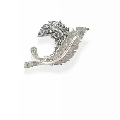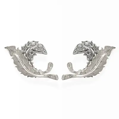 Orecchini in oro bianco 18 carati. Due foglie cesellate, una incisa a setato, una traforata a-jour con 0,34 carati di brillanti incastonati.