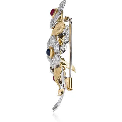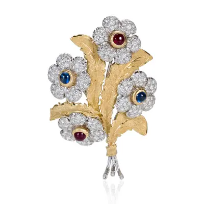 Spilla in oro bianco e giallo 18 carati composta da quattro foglie in oro giallo incise a setato e gambi rigati in oro bianco. Quattro fiori in oro bianco con pavé di brillanti per un totale di 2,72 carati. Quattro castoni rigati in oro giallo con due zaffiri per un totale 0,61 carati e due rubini per un totale di 0,4 carati.