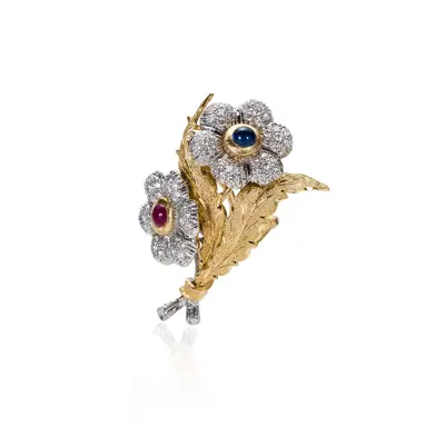 Orecchini in oro giallo e bianco 18 carati. Quattro foglie in oro giallo cesellate e incise a setato con gambi rigati in oro bianco. Quattro fiori in oro bianco con 1,03 ct per 2 zaffiri e 1,15 ct per 2 rubini centrali in castoni rigati in oro giallo e petali in pavé di brillanti per un totale di 2,73 ct.