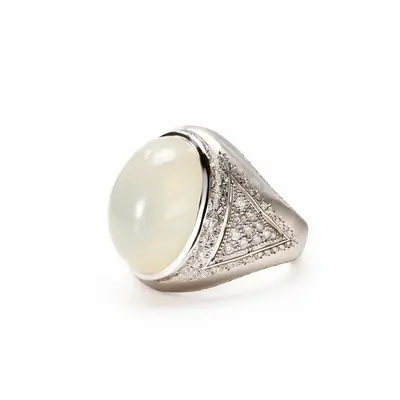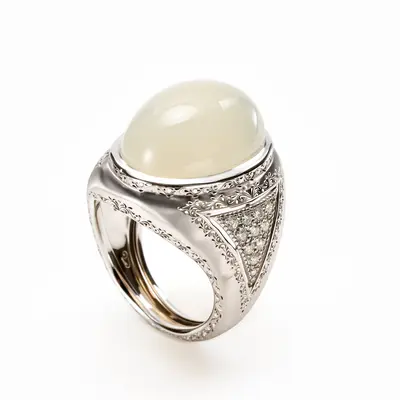 Anello in oro bianco 18 carati. Adularia centrale taglio cabochon, gambo inciso a millefili con motivo triangolare con pavé di brillanti per un totale di 0,66 carati.