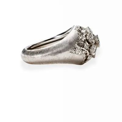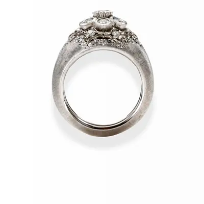 Anello in oro bianco 18 carati. Brillanti centrali all'interno di castoni modellati e disposti a fiore. Gambo inciso a millefili. Brillanti per un totale di 00,56 carati.