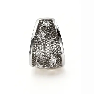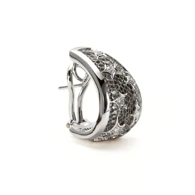 Orecchini con clip in oro bianco 18 carati. Lastra traforata a nido d'ape con castoni a stella e brillanti per un totale di 0,49 carati.