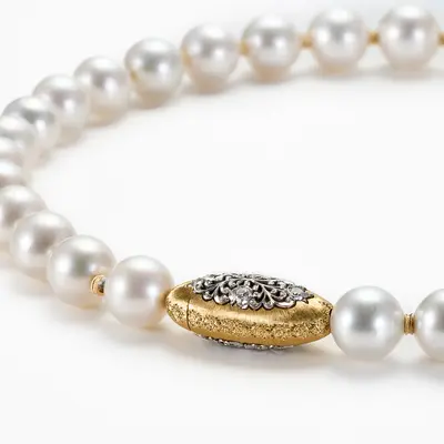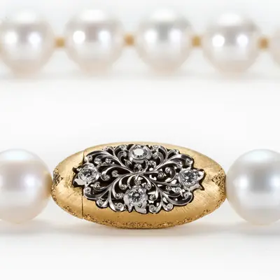 Collana di perle Akoya in oro bianco e giallo 18 carati. Chiusura a motivo floreale centrale traforato con 0,6 carati di brillanti. Corpo in oro giallo inciso a millefili e graffito.