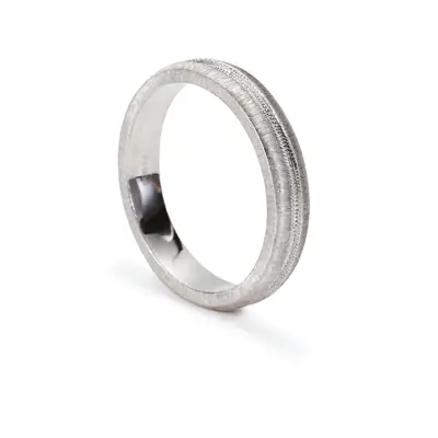 Fedina in platino. Bordo inciso a millefili e fascia centrale decorata.