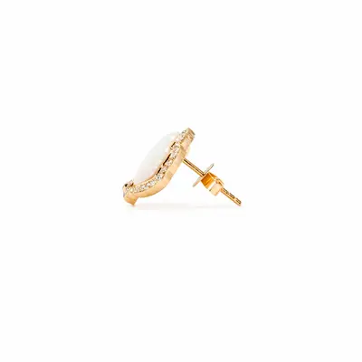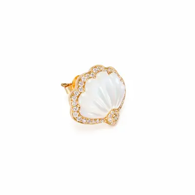 Orecchini a conchiglia in oro giallo 18 carati e madreperla. Bordo esterno decorato con pavé di brillanti e inciso a millefili.