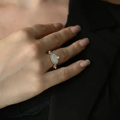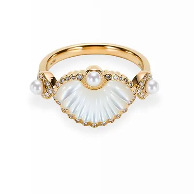 Fedina in oro giallo 18 carati. Conchiglia in madreperla con bordo in oro giallo decorato con brillanti per 0.16 carati.
