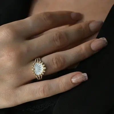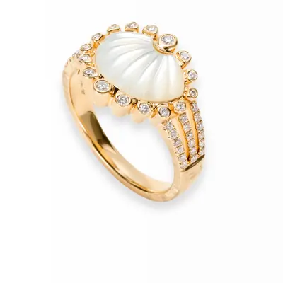 Fedina in oro giallo 18 carati. Conchiglia in madreperla contornata da oro giallo e brillanti. Corpo dell'anello arricchito da tre file di brillanti.