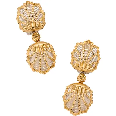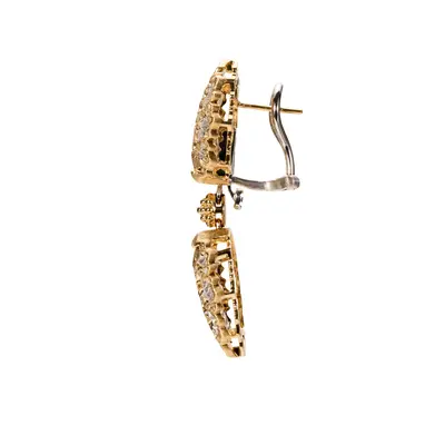 Orecchini in oro giallo e bianco 18 carati, da indossare sia a pendente che a lobo. La parte centrale, traforata a motivo di tela, è valorizzata da un raffinato bordo in oro giallo inciso a millefili.