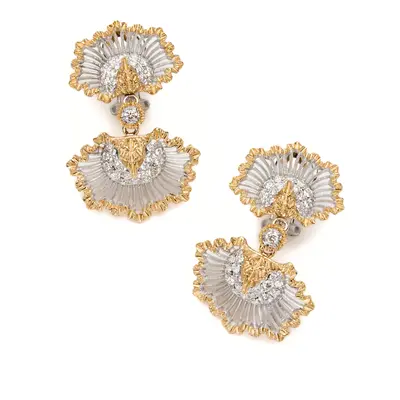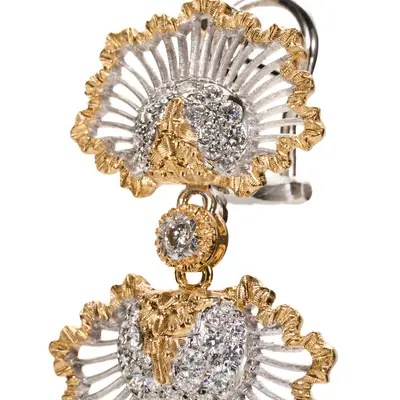 Orecchini in oro giallo e bianco 18 carati componibili, da indossare a pendente ed a lobo. Parte centrale traforata a tela e bordo in oro giallo inciso a millefili. Parte centrale decorata con pavé di brillanti e motivo inciso.
