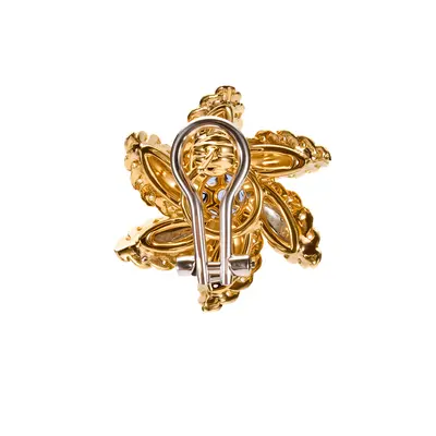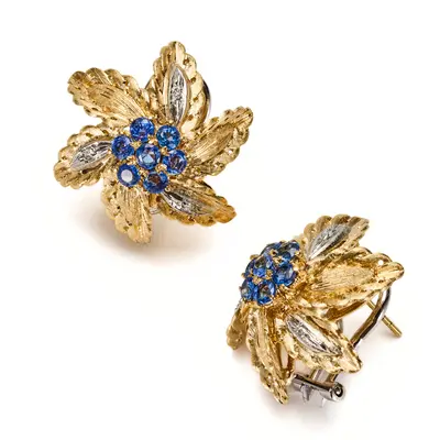 Orecchini in oro bianco e giallo 18 carati. Sei foglie cesellate e incise, tre petali in oro bianco con brillante incastonato. Pistilli centrali con sette zaffiri da 2 carati.