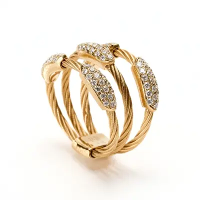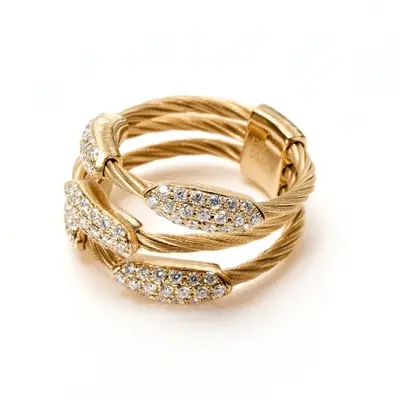 Anello torchon in oro giallo 18 carati. Tre fedine unite. Fedine con motivo a losanga con 0,78 ct di brillanti.