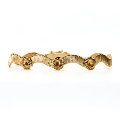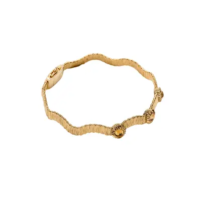 Bracciale in oro giallo 18 carati. Fascia formata da finissimi fili dorati intrecciati. Tre castoni a forma di sole incisi con 0,91 carati di zaffiri gialli taglio cabochon.