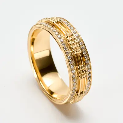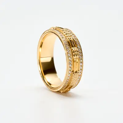 Fedina in oro giallo 18 carati. Bordo pallettato con due file di brillanti da 0,44 carati a giro. Fascia centrale incisa con finissime rigature interne.